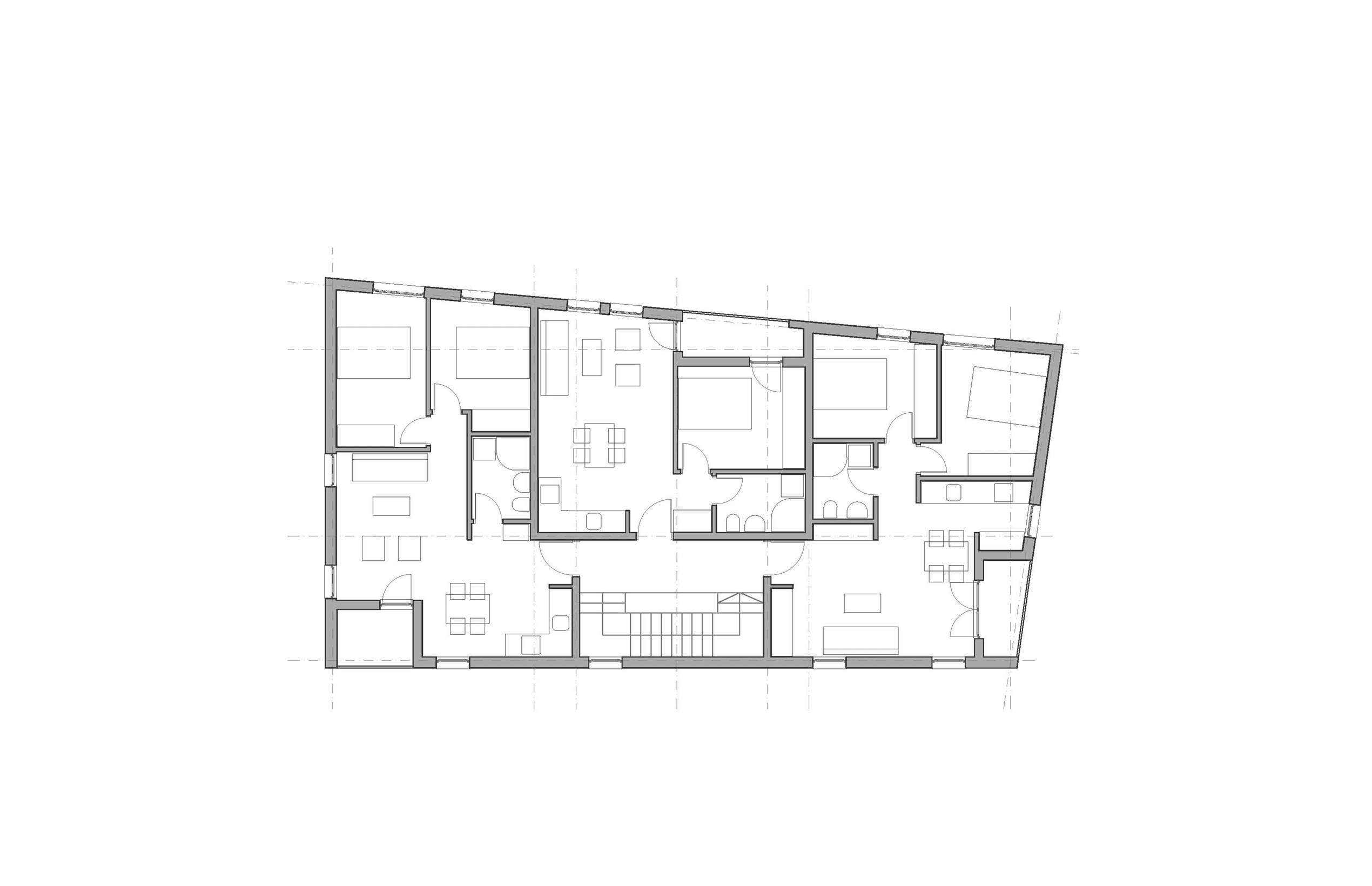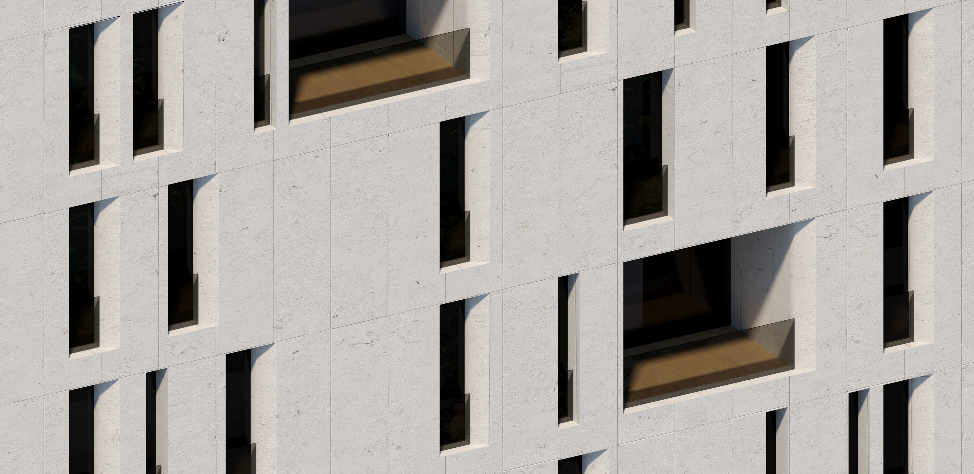 Contemporary infill volume integrated into a historically layered context through neutral massing and proportional alignment. Facade articulation introduces variation through openings and terraces, while maintaining a coherent overall form and respecting the surrounding urban fabric.